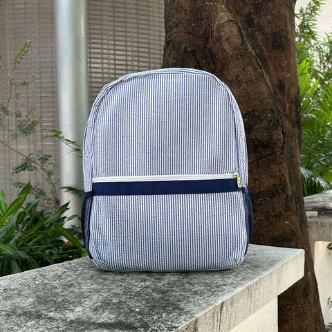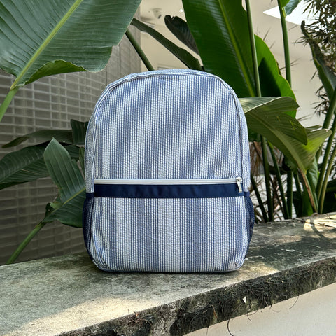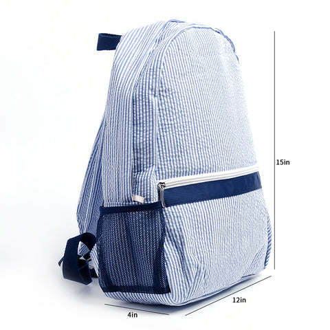 Our seersucker backpacks are very versatile. They are great full size school backpacks, diaper bags, overnight bags and great for car trips to pack toys and snacks in.